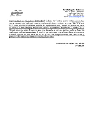 The popular assembly of Cambre expresses profound concern about the irregularities in the justification of expenses by the Department of Culture that directs Gabriel Méndez. The assembly ensures that the Department of Contracts will facilitate similar information about the contracts of the nationalist leader. Finally, the popular assembly demands greater transparency and accountability in the use of public funds.