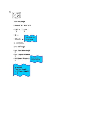 This mathematics document covers calculating perimeters and areas of different shapes. It discusses finding the perimeter and area of rectangles, as well as the areas of triangles, parallelograms, and trapezoids. Various formulas are presented and examples are worked through on how to calculate the heights, bases, and areas of these shapes. Problem solving questions involving perimeters and areas are also addressed.