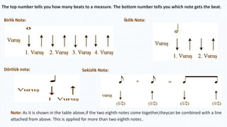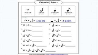 The document explains how to count beats in music by discussing time signatures and note values. It shows students different note durations like half, quarter, eighth, and sixteenth notes. It explains how multiple shorter notes can be combined with a line when they occur together. After providing this information, students are asked to calculate the beat value of musical examples. The goal is for students to learn about beat, rhythm, patterns, and tempo in music through mathematical calculation and playing rhythm instruments.