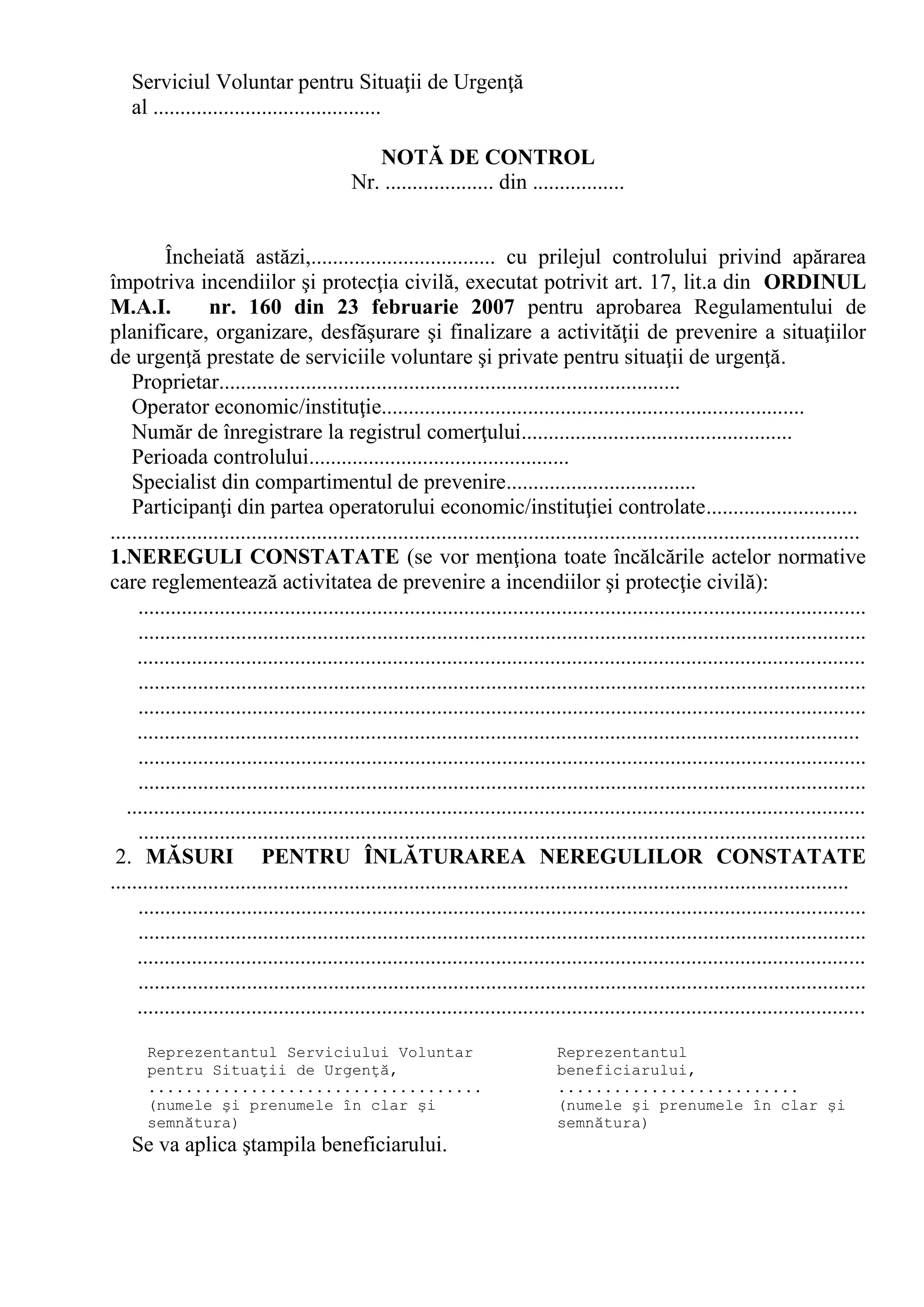 Documentul prezintă rezultatele unui control efectuat asupra serviciului voluntar pentru situații de urgență, în conformitate cu reglementările legale privind apărarea împotriva incendiilor și protecția civilă. Acesta include nereguli constatate și măsuri recomandate pentru remedierea acestora. Este semnat de reprezentanții serviciilor implicate și se aplică ștampila beneficiarului.
