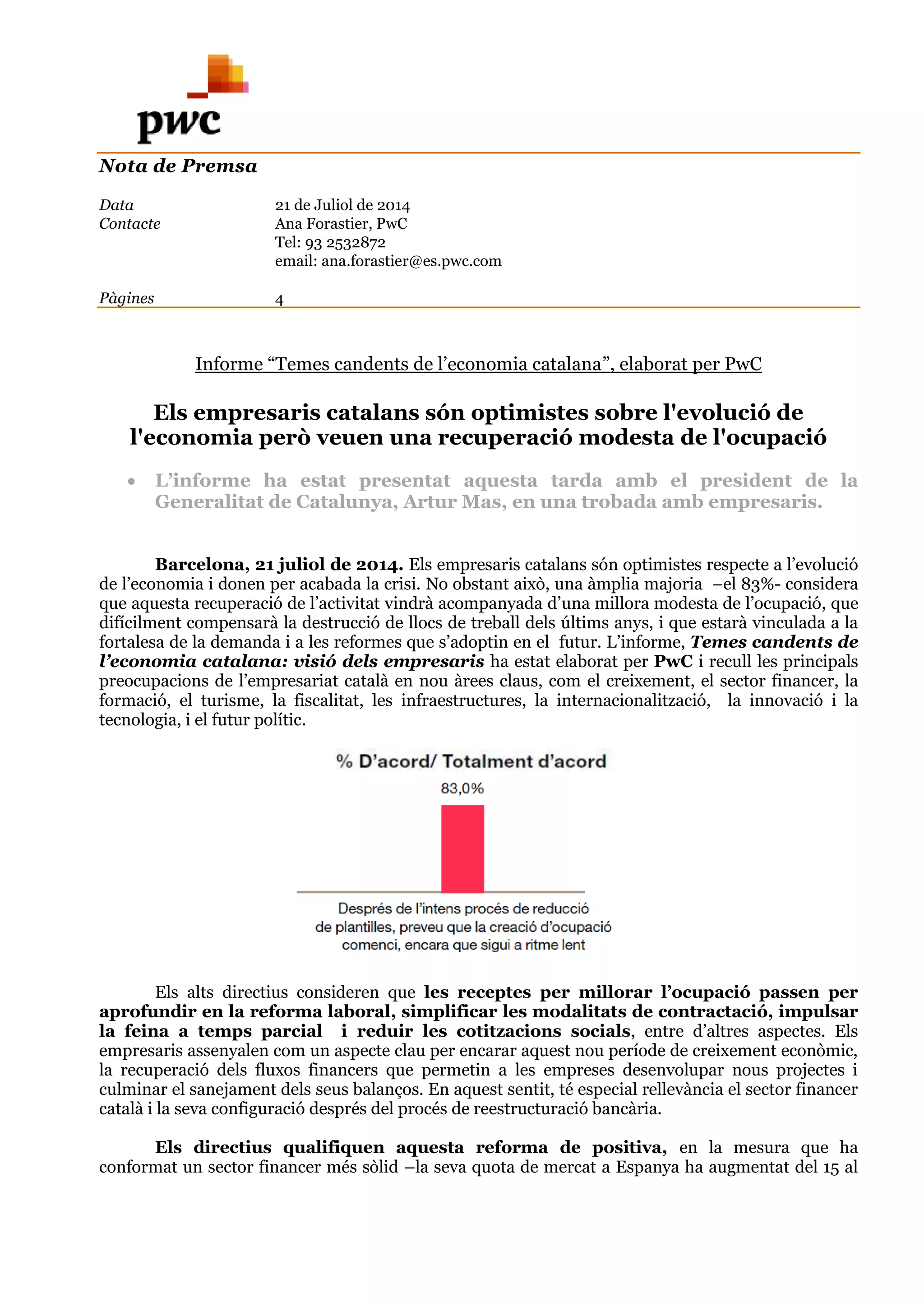 l’economia catalana: visió dels empresaris ha estat elaborat per PwC i recull les principals