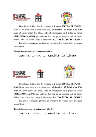Benvolgudes famílies, dins del programa a la nostra ESCOLA DE PARES I