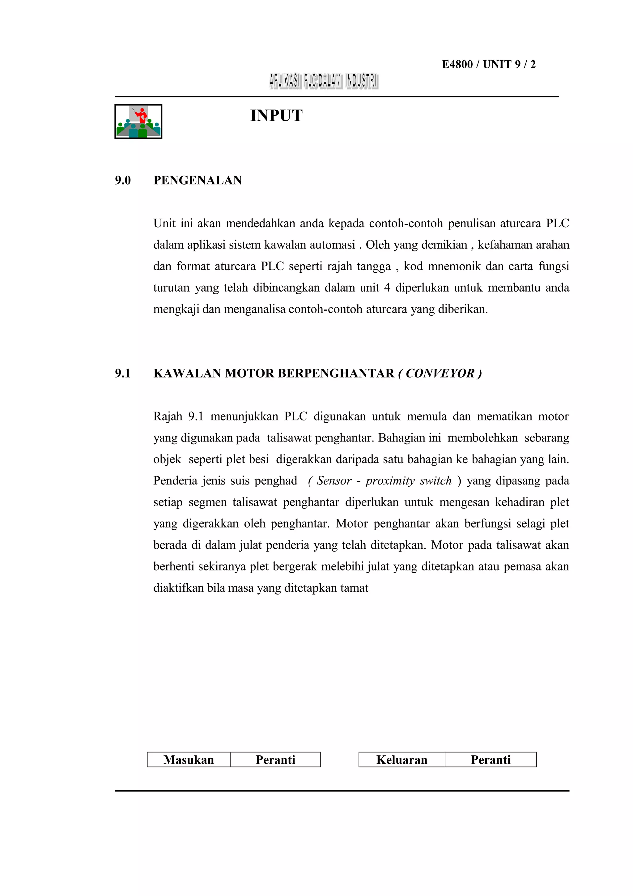 Dokumen ini menjelaskan tentang cara menulis aturcara PLC untuk pelbagai aplikasi sistem kawalan automasi, termasuk kawalan motor penghantar, pemilihan bahan, pembungkusan, lampu trafik, dan pengisian-keluaran. Dengan memberikan contoh rajah tangga dan kod mnemonik, ia membimbing pembaca untuk memahami format dan arahan yang diperlukan dalam aturcara PLC. Penekanan juga diberikan kepada sensitifiti dan fungsi pelbagai penderia dalam pengoperasian sistem tersebut.