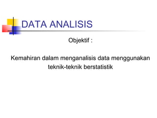 Dokumen ini membincangkan kaedah penyelidikan dan analisis data, termasuk teknik statistik deskriptif dan inferens. Ia menerangkan kategori statistik, skala pengukuran, dan langkah-langkah pengujian hipotesis untuk membuat kesimpulan mengenai populasi berdasarkan sampel. Selain itu, penulis meneroka penggunaan perisian SPSS untuk analisis statistik dan grafik.