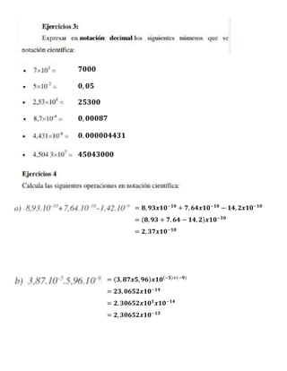 This document contains a series of mathematical calculations involving exponential notation. It includes: 1) Adding, subtracting, and multiplying terms with different exponential components, such as 2.37x10-10. 2) Performing operations like multiplication and division inside exponential expressions, such as 23.0652x10-14. 3) Simplifying exponential expressions by adding or subtracting their exponential components, such as 4x10-6.