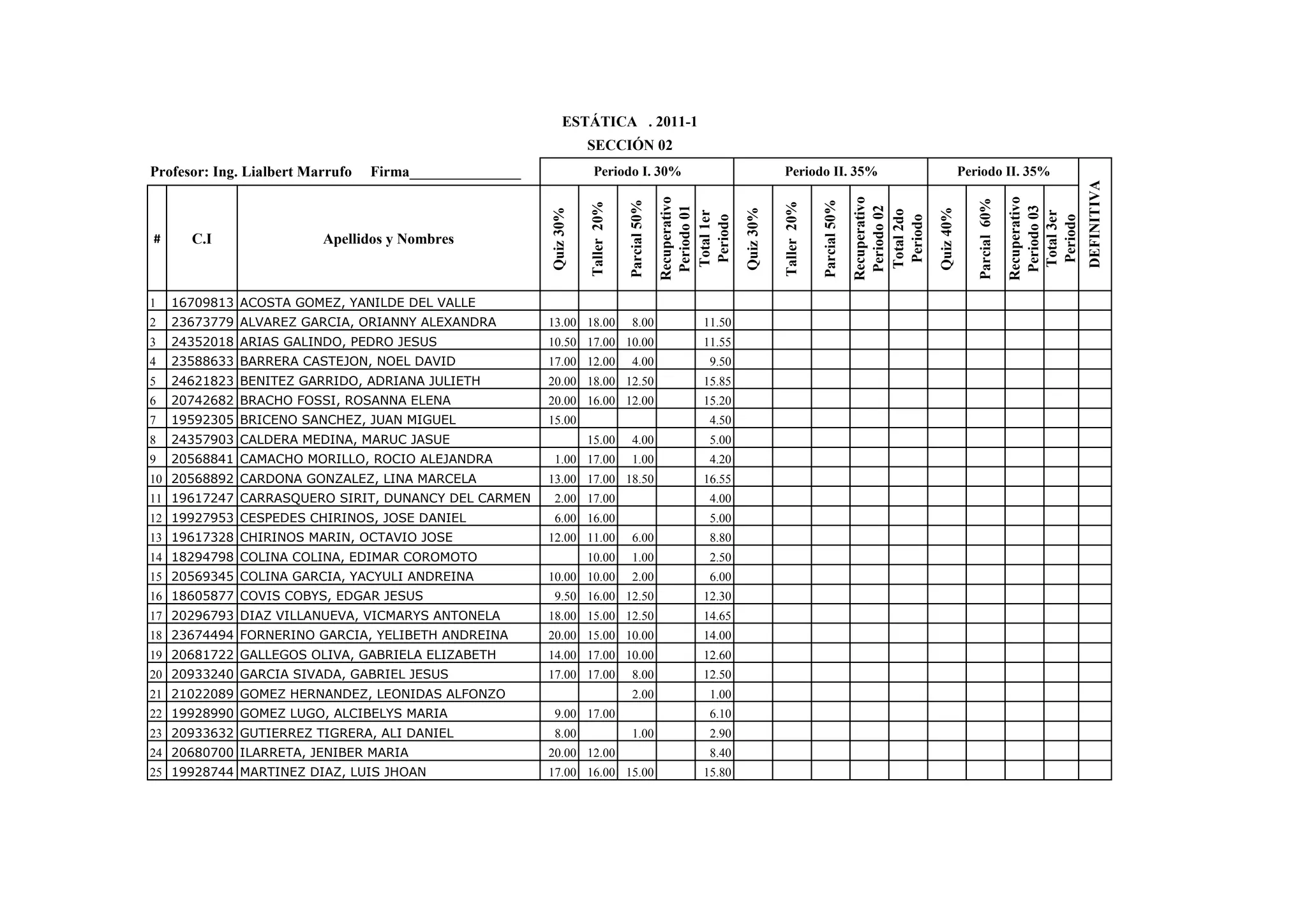 SECCIÓN 02 Profesor: Ing. Lialbert Marrufo Firma_______________ Periodo I. 30% Periodo II. 35% Periodo II. 35% DEFINITIVA Recuperativo Recuperativo Recuperativo Parcial 60% Parcial 50% Parcial 50% Taller 20% Taller 20% Periodo 01 Periodo 02 Periodo 03 Quiz 30% Quiz 30% Quiz 40% Total 2do Total 1er Total 3er Periodo Periodo Periodo # C.I Apellidos y Nombres 1 16709813 ACOSTA GOMEZ, YANILDE DEL VALLE 2 23673779 ALVAREZ GARCIA, ORIANNY ALEXANDRA 13.00 18.00 8.00 11.50 3 24352018 ARIAS GALINDO, PEDRO JESUS 10.50 17.00 10.00 11.55 4 23588633 BARRERA CASTEJON, NOEL DAVID 17.00 12.00 4.00 9.50 5 24621823 BENITEZ GARRIDO, ADRIANA JULIETH 20.00 18.00 12.50 15.85 6 20742682 BRACHO FOSSI, ROSANNA ELENA 20.00 16.00 12.00 15.20 7 19592305 BRICENO SANCHEZ, JUAN MIGUEL 15.00 4.50 8 24357903 CALDERA MEDINA, MARUC JASUE 15.00 4.00 5.00 9 20568841 CAMACHO MORILLO, ROCIO ALEJANDRA 1.00 17.00 1.00 4.20 10 20568892 CARDONA GONZALEZ, LINA MARCELA 13.00 17.00 18.50 16.55 11 19617247 CARRASQUERO SIRIT, DUNANCY DEL CARMEN 2.00 17.00 4.00 12 19927953 CESPEDES CHIRINOS, JOSE DANIEL 6.00 16.00 5.00 13 19617328 CHIRINOS MARIN, OCTAVIO JOSE 12.00 11.00 6.00 8.80 14 18294798 COLINA COLINA, EDIMAR COROMOTO 10.00 1.00 2.50 15 20569345 COLINA GARCIA, YACYULI ANDREINA 10.00 10.00 2.00 6.00 16 18605877 COVIS COBYS, EDGAR JESUS 9.50 16.00 12.50 12.30 17 20296793 DIAZ VILLANUEVA, VICMARYS ANTONELA 18.00 15.00 12.50 14.65 18 23674494 FORNERINO GARCIA, YELIBETH ANDREINA 20.00 15.00 10.00 14.00 19 20681722 GALLEGOS OLIVA, GABRIELA ELIZABETH 14.00 17.00 10.00 12.60 20 20933240 GARCIA SIVADA, GABRIEL JESUS 17.00 17.00 8.00 12.50 21 21022089 GOMEZ HERNANDEZ, LEONIDAS ALFONZO 2.00 1.00 22 19928990 GOMEZ LUGO, ALCIBELYS MARIA 9.00 17.00 6.10 23 20933632 GUTIERREZ TIGRERA, ALI DANIEL 8.00 1.00 2.90 24 20680700 ILARRETA, JENIBER MARIA 20.00 12.00 8.40 25 19928744 MARTINEZ DIAZ, LUIS JHOAN 17.00 16.00 15.00 15.80