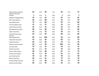 This document appears to contain grades for multiple students in a class across several assignments and overall averages. It lists each student's name along with their grades on assignments worth 10%, 40% and 50% of the total grade, as well as their final overall average. Grades range from 1 to 100 on individual assignments and averages range from 60 to 95 overall.