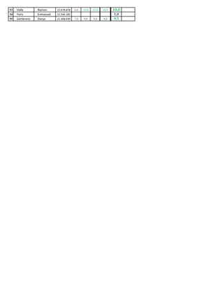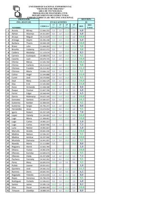 This document appears to be a grade report for a Mechanics course at the Universidad Nacional Experimental "Francisco de Miranda" listing 55 students. It includes each student's name, identification number, grades on tests, projects, and exams throughout the semester, as well as their final letter grade and average. The grades were assessed based on tests, projects, and exams worth 20%, 20%, 20% and 20% respectively, with the final exam worth the remaining 20%.