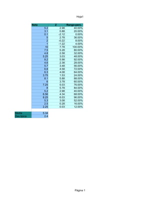 The document contains a table with three columns: Note, Z, and Range-perc. It includes data for 28 rows with values for each column. The mean of the values in the Note column is 5.34 and the standard deviation is 2.4.