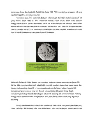 Dokumen ini menerangkan sejarah perkembangan matematik yang dibahagikan kepada empat peringkat utama dari zaman awal hingga kini, termasuk pengaruh tamadun Babylon, Yunani, Mesir, China, dan India. Setiap peringkat menunjukkan kemajuan dalam bidang aritmetik, geometri, algebra, dan teori nombor. Perkembangan tersebut telah menyumbang kepada matematik moden dan aplikasinya dalam sains, teknologi, dan bidang lain.