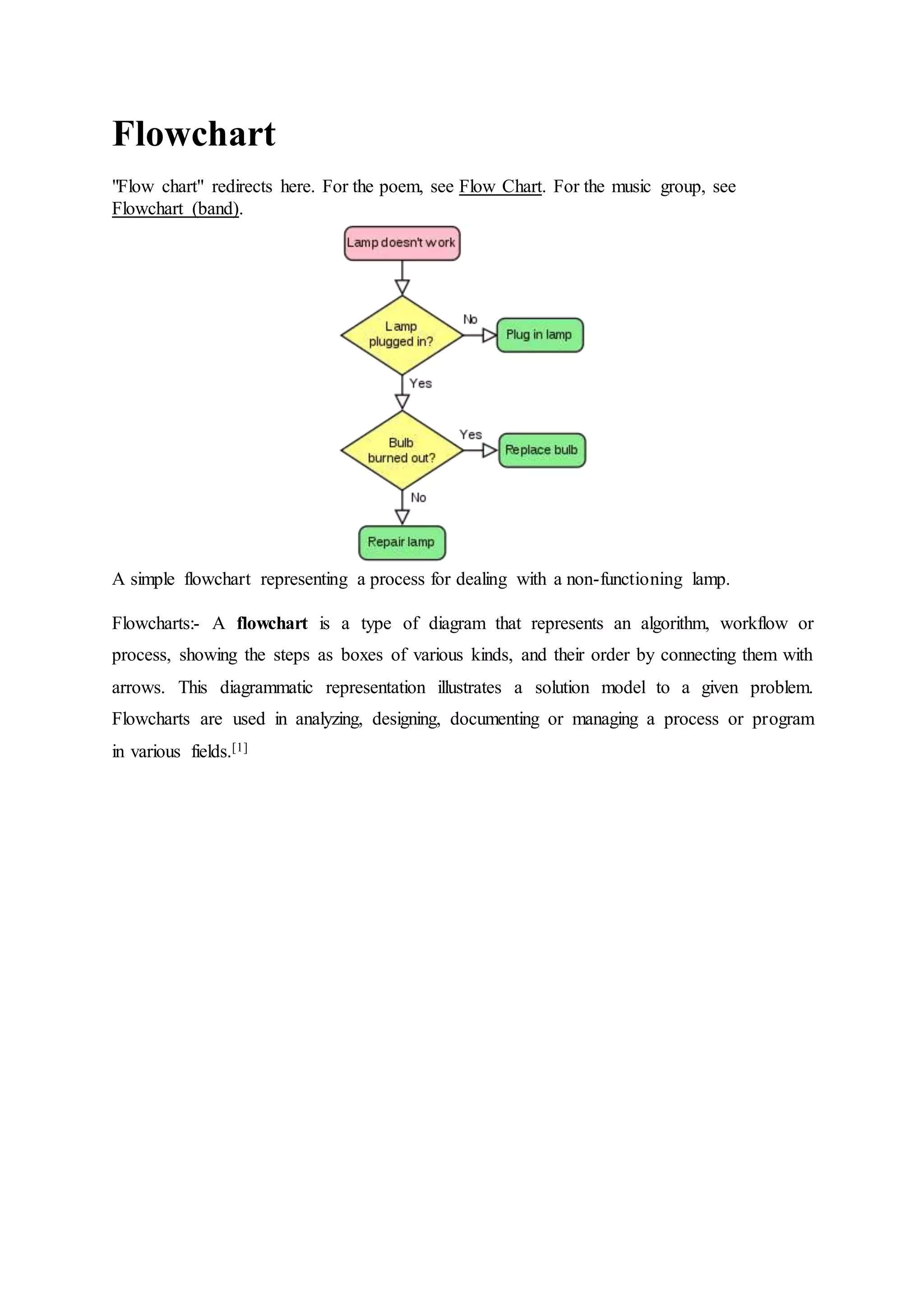 This document provides an overview of flowcharts, including: