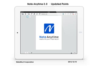 Note Anytime 2.0 provides several new features and enhancements to improve the expressiveness and functionality of the note taking application. Key updates include expanded color selection options using a color wheel, additional pen types like highlighters and fountain pens for more expressive note taking. The user interface was also overhauled with a simpler design and new navigation bar. Additional features improve text editing options, file import/export capabilities, and cloud storage support through Google Drive.