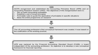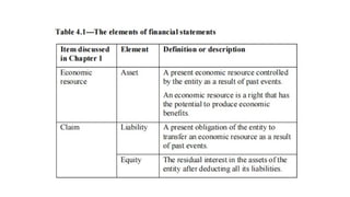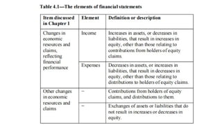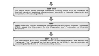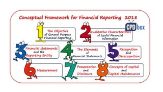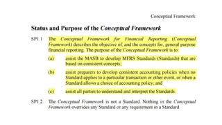 The document outlines the conceptual framework for financial accounting, detailing its objectives, qualitative characteristics, and the principles guiding financial reporting. It emphasizes the importance of the framework in assisting standard setters, preparers, auditors, and users by providing clarity in financial statements and guiding decision-making. Updates to the framework have been made to enhance relevance and clarity of concepts such as asset and liability definitions, measurement, and presentation.