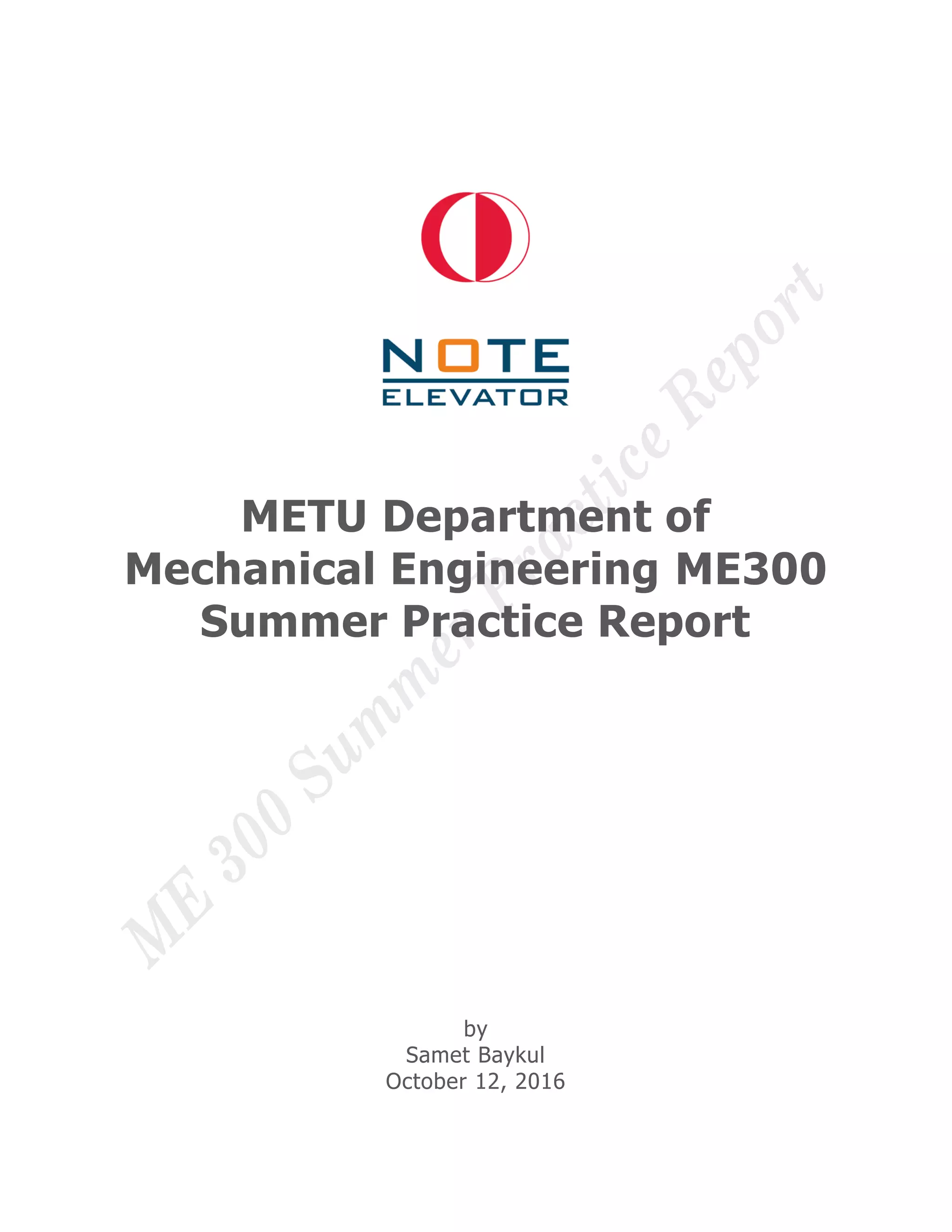 The ME300 Summer Practice Report by Samet Baykul provides an overview of the Note Elevator company, detailing its organizational structure, manufacturing processes, and specific projects undertaken during an internship. The report outlines the technical and operational aspects of the elevator manufacturing process, including various techniques such as shearing, drilling, and welding. It highlights the company's focus on delivering customized elevator solutions and the challenges faced in manufacturing efficiency and quality control.