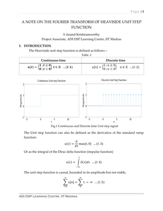 The document discusses the Fourier transform of the Heaviside unit step function, noting its non-existence due to properties that make it neither absolutely nor square summable. Various approaches are presented for deriving the Fourier transform, including the differential method, the signum function approach, and the z-transform approach, all yielding different results that incorporate impulse signals. Conclusions highlight that the results from different methods hold valid within their respective domains of continuous and discrete time functions.