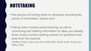 Note taking involves actively listening and connecting new information to prior knowledge. Effective note taking requires recognizing main ideas, identifying relevant information, having an organized system, and recording information in your own words. Different note taking systems include the Cornell method of taking notes in the main space and labeling ideas in the left margin, outlining to show hierarchical relationships through indentation, mapping to graphically represent relationships, and charting or sentences to organize information into categories or individual points.