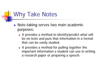 The document provides guidance on effective note-taking techniques for academic purposes. It discusses four main purposes for note-taking: to provide a written record for review, force the listener to pay attention, require organization which involves active effort, and require condensing and rephrasing which aid understanding. It also offers suggestions for good note-taking such as labeling notes, using separate notebooks, writing legibly, and developing abbreviations.