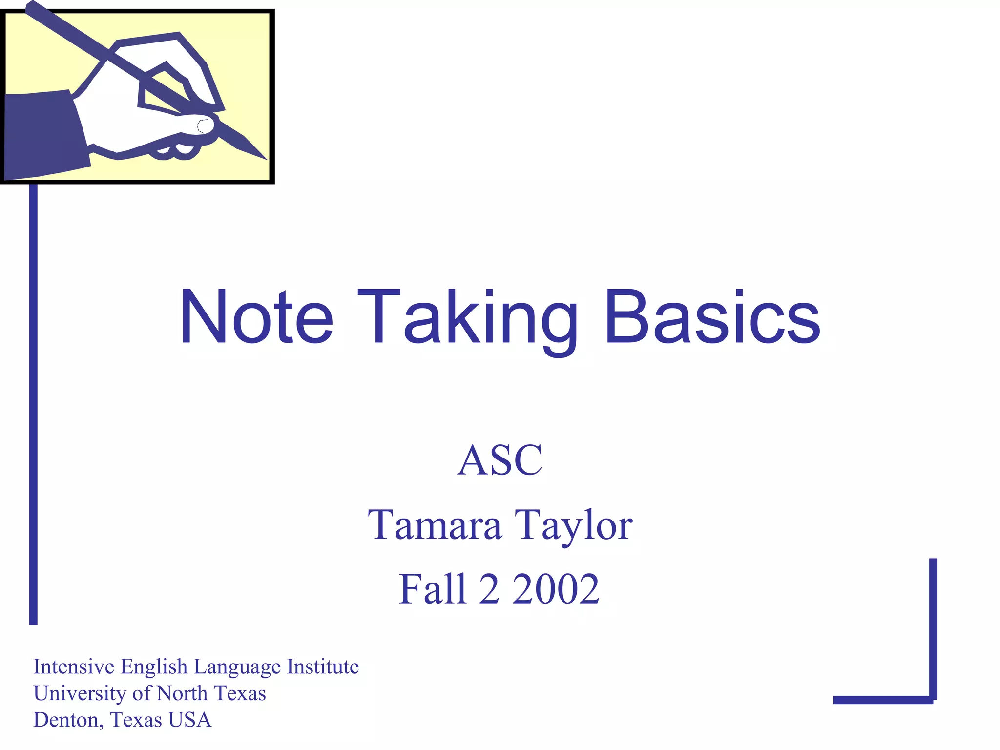 This document provides tips for effective note taking. It recommends practicing note taking skills daily, as listening and note taking only improve with practice. Successful note taking involves listening for key words and writing complete ideas rather than sentences. Notes should use spacing, headings, abbreviations and symbols to organize information and show relationships between ideas. The overall goal is to understand the main points and big picture of the material in a way that supports effective studying from one's notes.
