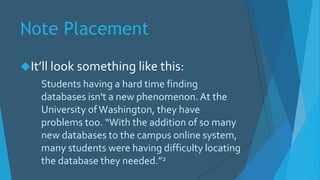 The document provides instructions on how to properly format footnotes and place note citations in a document. It explains that note numbers should be placed as superscripts after clauses or sentences, but before punctuation except dashes. It also explains that footnotes should include the author's last name, shortened title, and page number separated by commas, and how to use "Ibid" to cite the same source on consecutive or different pages.