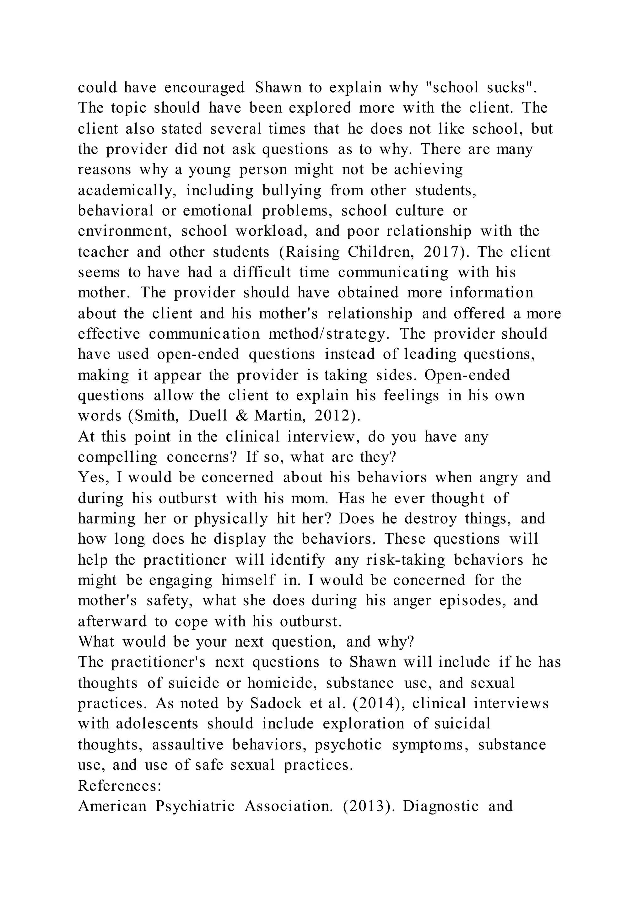 The document discusses a mental health assessment of a 16-year-old boy named Shawn who was brought to an outpatient clinic by his mother. The practitioner must work to engage Shawn in the assessment since he did not want to be there. The assessment aims to understand the chief complaint, make a diagnosis, identify the cause of issues, and develop a treatment plan while also assessing risk of suicide or homicide. The practitioner maintained good eye contact and listened well to Shawn. Areas for improvement include exploring why Shawn does not like school, obtaining more information about Shawn's relationship with his mother, and using open-ended questions.