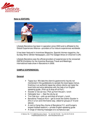 Lifestyle Barcelona, operating since 2003 and part of the Global Experiences Alliance, offers unique leisure experiences in Barcelona, including culinary tours, adventure activities, and romantic packages. The company was the official provider for the EIBTM trade show in 2009 and features a range of services such as helicopter tours, spa treatments, and organized treasure hunts. Contact details and a website are provided for further inquiries.