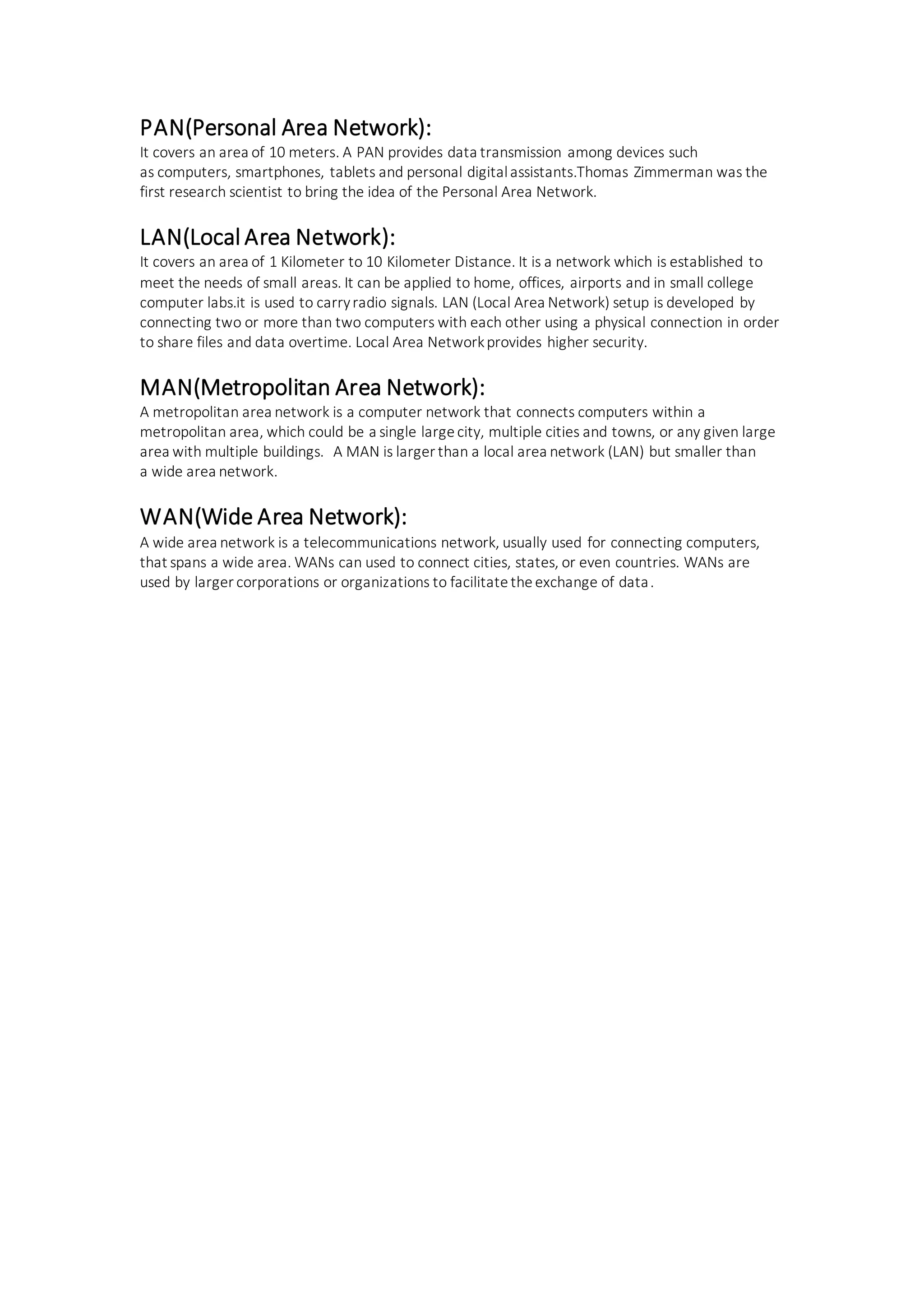 PAN covers an area of 10 meters and provides data transmission between devices like computers, phones, and PDAs. Thomas Zimmerman first proposed the idea of a personal area network. LAN connects computers within 1-10 km to share files and data through a physical connection, providing higher security within offices, homes, and colleges. MAN connects computers within a metropolitan area larger than a LAN but smaller than a WAN, such as within a city or multiple cities. WAN spans wide areas like cities, states, or countries to facilitate data exchange for large corporations and organizations.