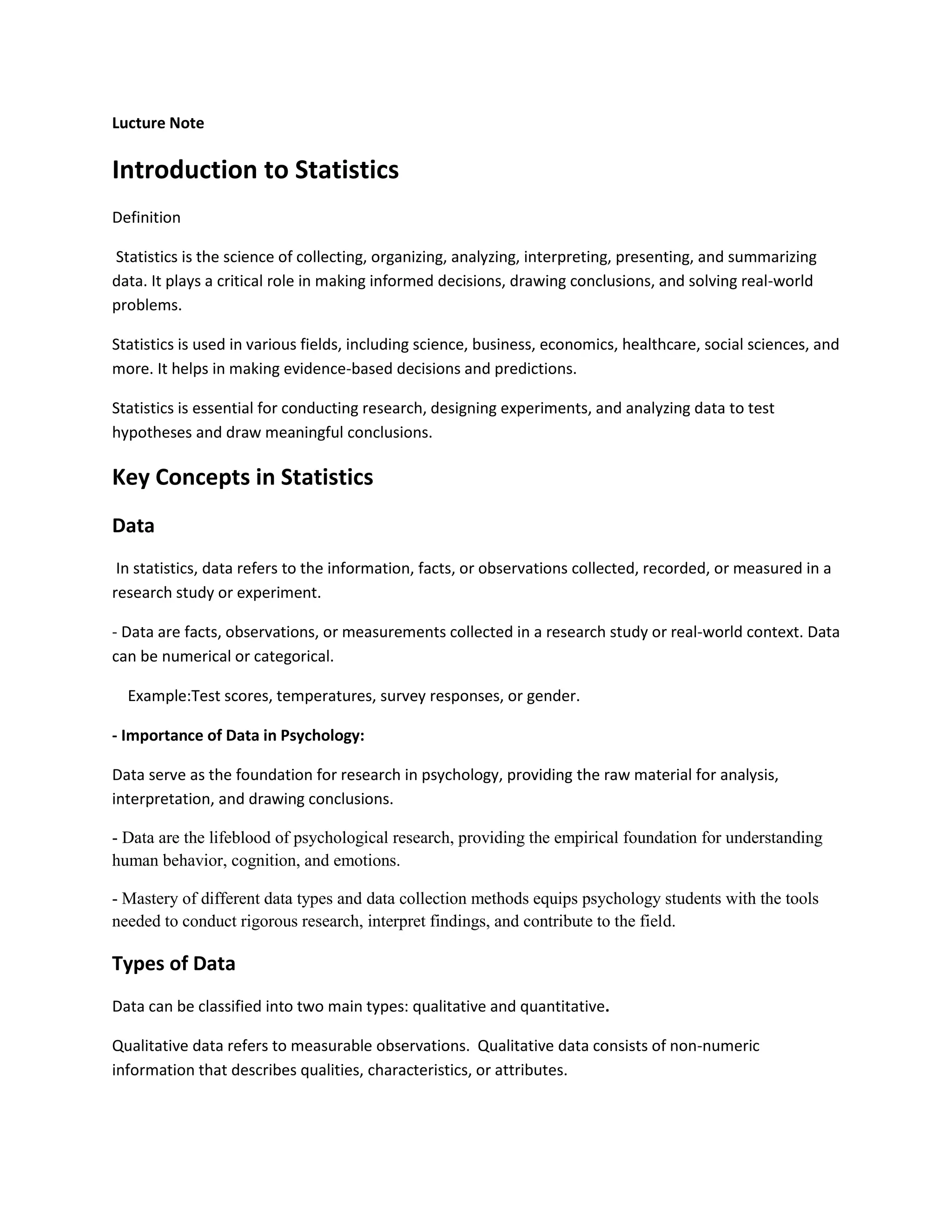 Statistics is the science of collecting, organizing, analyzing, and summarizing quantitative and qualitative data. It plays a critical role in research, decision-making, and problem-solving across many fields. There are two main types of data: quantitative data that can be measured numerically and qualitative data that describes attributes. Data can also be classified based on their properties into nominal, ordinal, interval, and ratio scales. Descriptive statistics summarize and describe data, while inferential statistics make predictions about populations from samples. Population refers to the entire group being studied, while a sample is a subset used to represent the population. Careful data collection is crucial for research.