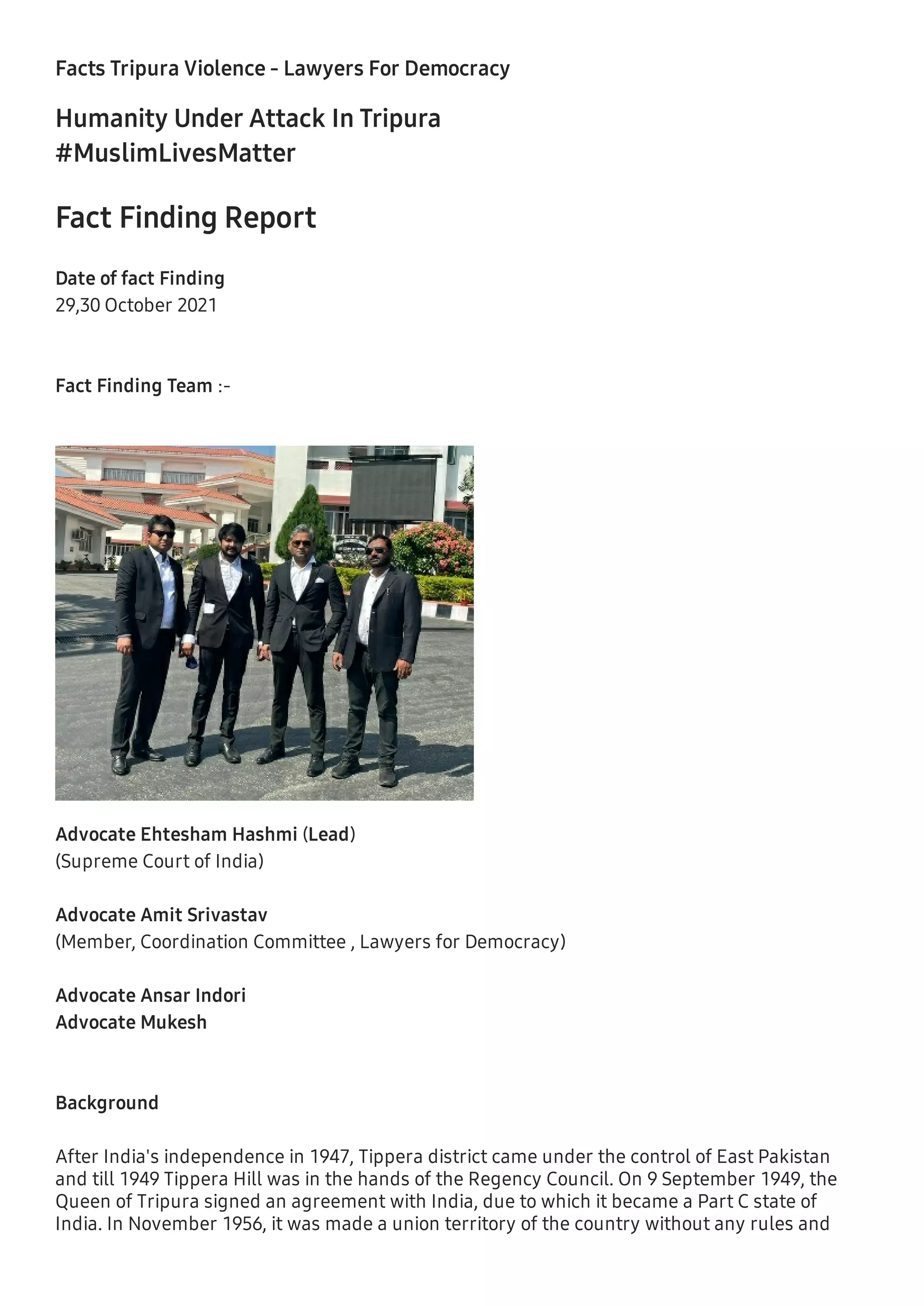 This document provides background information on violence against Muslims that occurred in Tripura, India in October 2021. It then details interviews conducted with 12 Muslim victims whose shops and homes were looted and burned during mob attacks. The interviews describe the significant financial losses suffered and ongoing fears about safety. The attacks appear linked to rallies organized by Hindu nationalist groups to protest violence against Hindus in Bangladesh. Local BJP politicians are accused of failing to prevent the attacks.