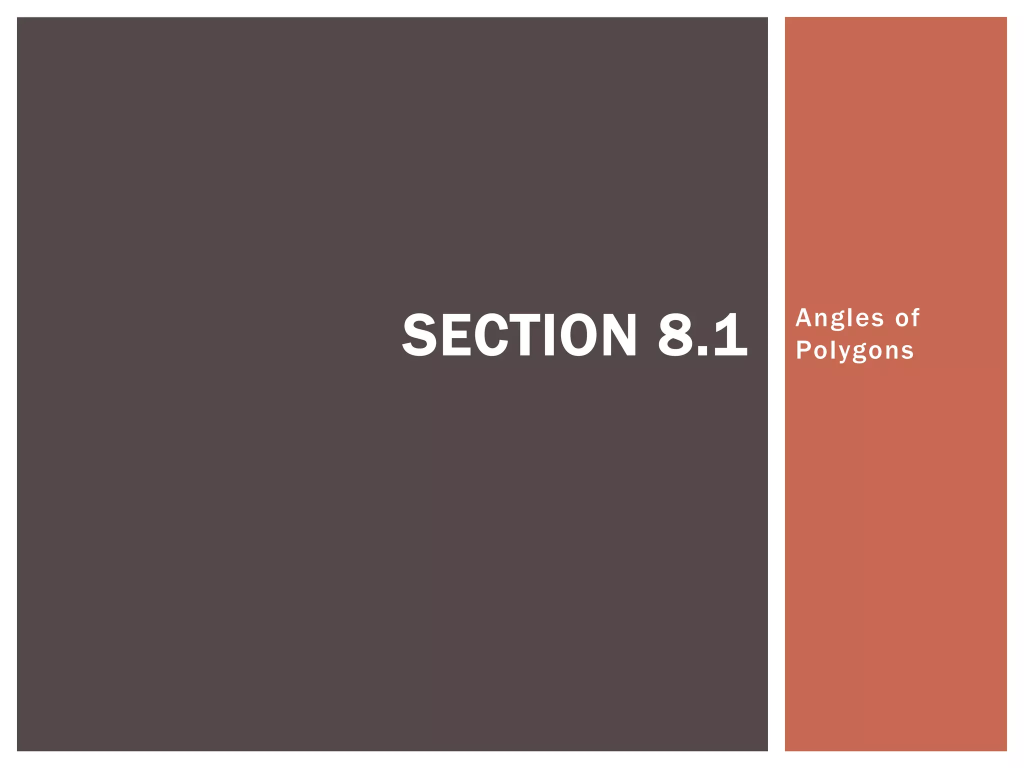 This document discusses interior and exterior angles of polygons. It states the Interior Angle Sum Theorem that the sum of interior angles of a convex polygon with n sides is 180(n-2). It also states the Exterior Angle Sum Theorem that the sum of exterior angles of any polygon is 360 degrees. Examples are provided to find the number of sides of a polygon given the interior angle measure and to calculate interior and exterior angle measures. Students are assigned related homework problems.