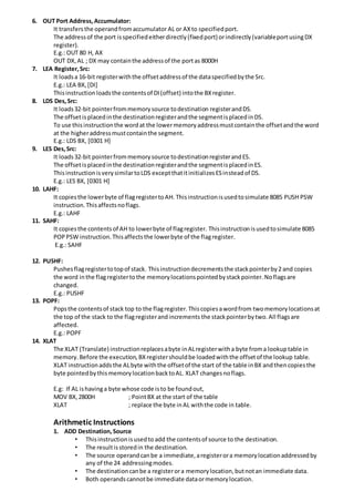 The document classifies 8086 instruction sets into various categories, including data transfer, arithmetic, and control instructions. It details each instruction type, explaining their functions, syntax, and examples such as 'mov', 'add', 'sub', and 'cmp'. Additionally, it describes how specific instructions affect CPU flags and the data types they operate on.