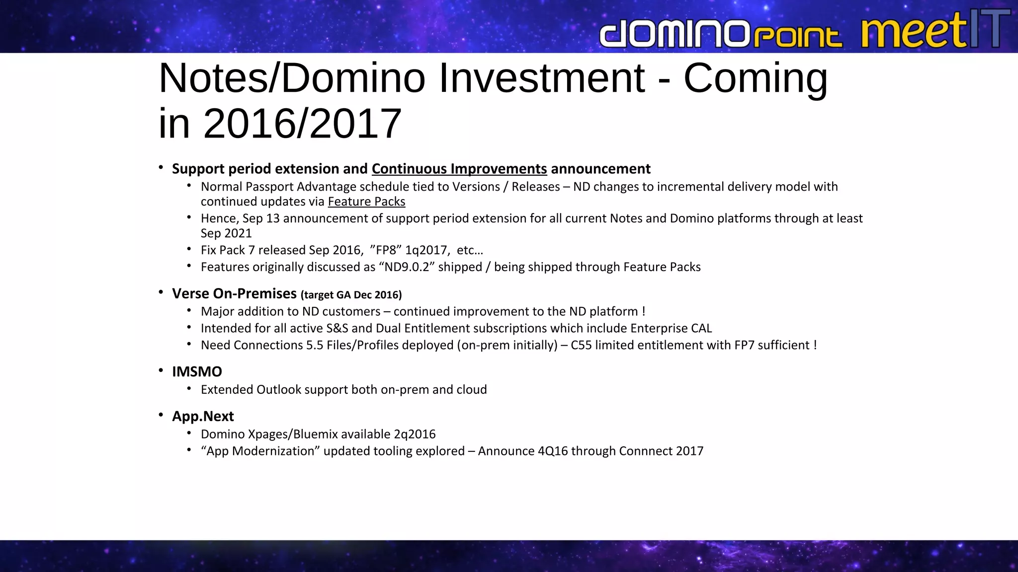 IBM presented its Notes and Domino roadmap, which includes continued support for current platforms through 2021, quarterly feature packs for incremental improvements, and the general availability of Verse On-Premises in December 2016. The roadmap aims to accelerate feature delivery through a continuous update model and provide customers choice in collaboration solutions.
