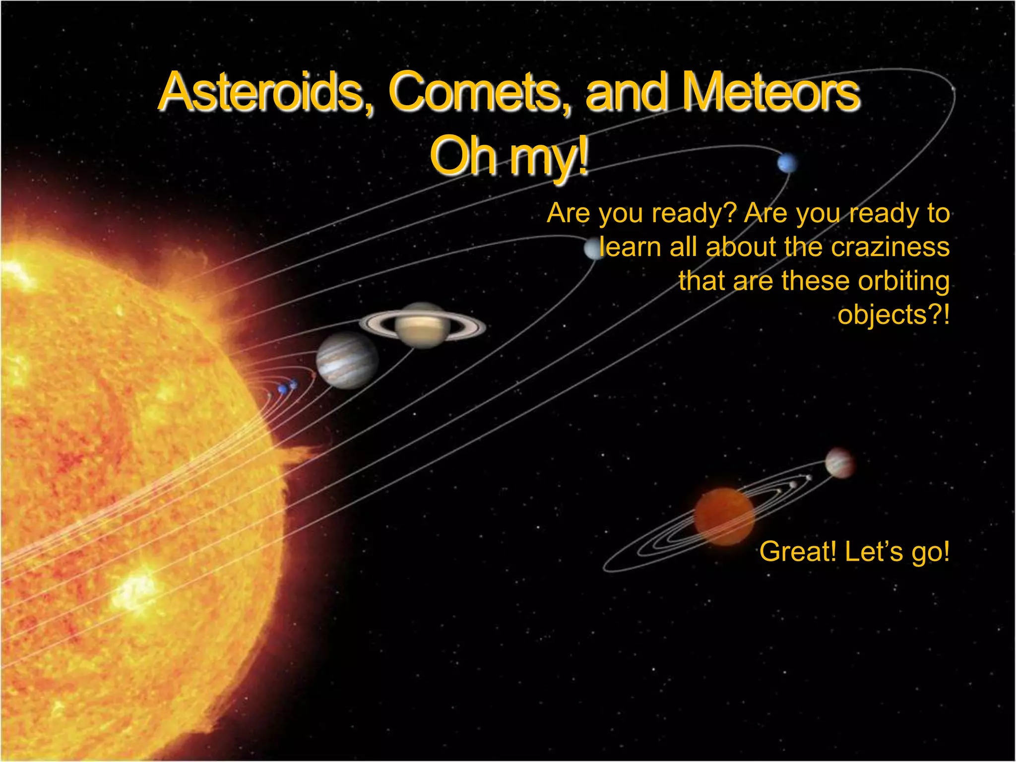 This document provides information about asteroids, comets, and meteors. It defines asteroids as rocky objects found between Mars and Jupiter, comets as icy objects with elliptical orbits that form tails as they near the sun, and meteors as solid particles that burn up in Earth's atmosphere. It distinguishes meteoroids as outside the atmosphere, meteorites as inside it after burning up, and meteors as the particles in between.