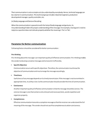 The document discusses several semantic barriers to communication, including badly expressed messages that can be misinterpreted, words with multiple meanings, faulty translations, assumptions made by the sender, use of technical jargon, and misinterpreting body language and gestures. It then provides parameters for better communication such as pre-thinking, having a specific objective, being timely, concise, complete, correct, persuasive, concrete, and including feedback.