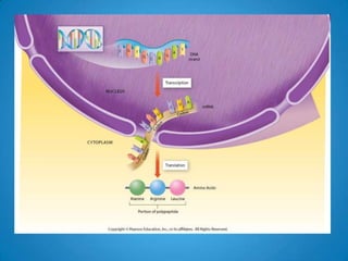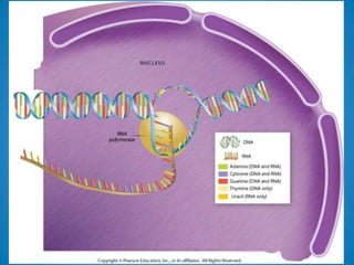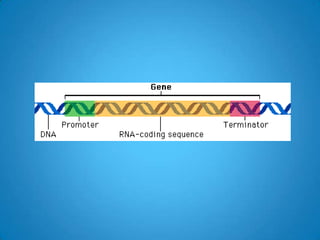 1. DNA contains genes that provide instructions for building proteins through transcription and translation. RNA is produced through transcription and carries the genetic code from DNA. There are three main types of RNA: mRNA, rRNA, and tRNA.