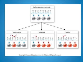 3. Mutations in DNA can occur through changes in single nucleotides or the insertion/deletion of nucleotides. This can alter the mRNA and resulting protein sequence produced.