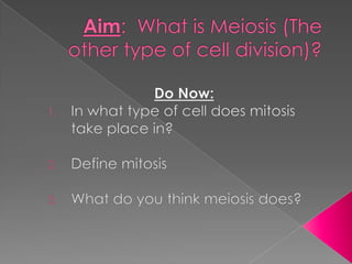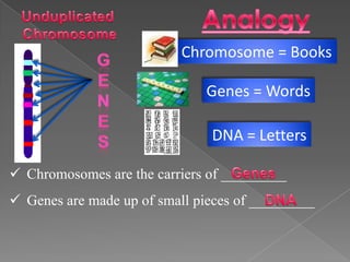 Chromosomes carry DNA and are made up of genes. In humans, body cells contain 46 chromosomes that come in 23 pairs, with one chromosome of each pair coming from the male parent and the other from the female parent. Homologous chromosome pairs are similar in size, shape, and genes. Sex cells such as eggs and sperm contain only 23 chromosomes each as a result of meiosis, which reduces the number of chromosomes in sex cells.