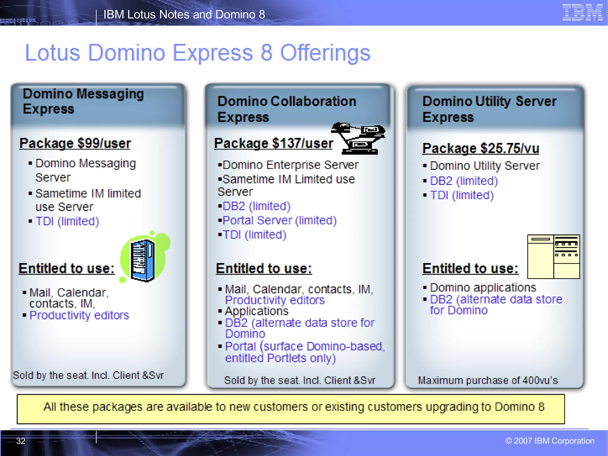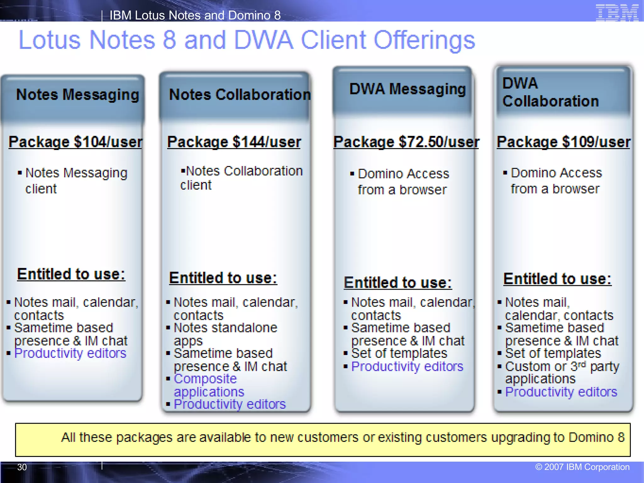 Lotus Domino 8New and enhanced messaging - Message recall - Improved out-of-office - Web password lockout Dramatic improvements in admin, performance and security Open applications infrastructure - Web services provider & consumer - Support for IBM DB2® as alternative data store Consistent architecture - Simple upgrade - Same API’s - Same infrastructure - Management and provisioning of Notes 8 right from the Domino server