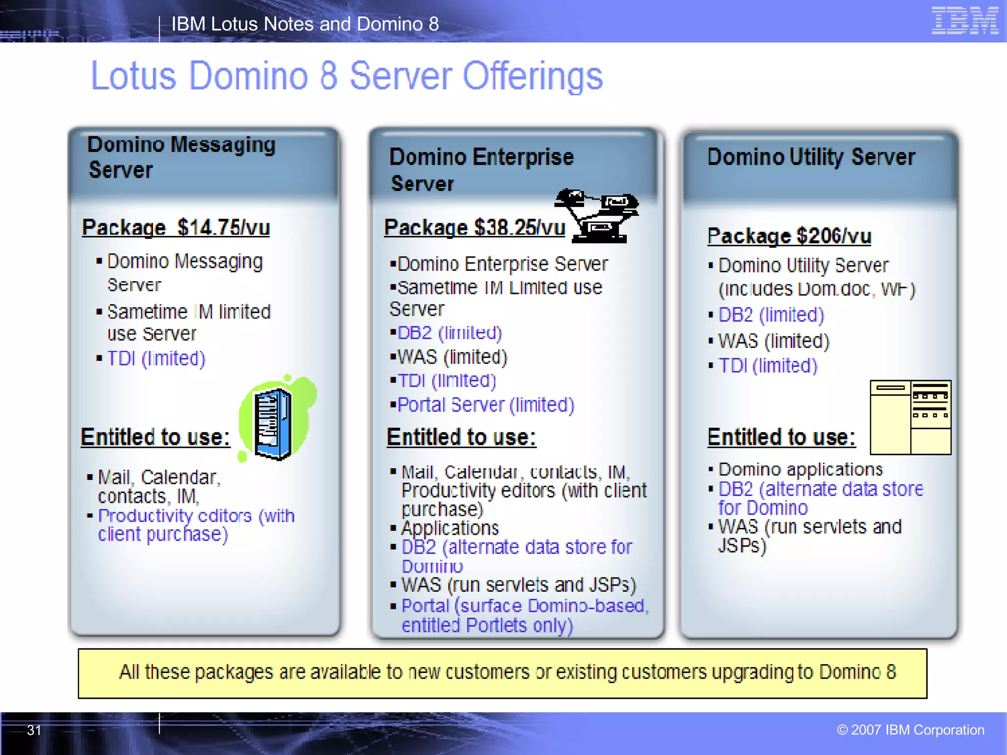 8 סיבות שמנהלי IT יאהבו את לוטוס נוטס / דומינו 8 ממשק משתמש משופר ממנף את ההשקעות הקיימות במוצרי יבמ שליטה על שידרוגים באמצעות יכולות ניהול פשוטות ארכיטקטורה פתוחה , גמישה , ניתנת להרחבה , מבוססת סטנדרטים מוסכמים ניצול יכולות שיתוף מוכחות , מעבר לאי - מייל כלי עריכה משולבים בקליינט גמישות בפלטפורמה עבור השרת והקליינט יכולות אבטחה מובילות , אמינות מוכחת וזמינות גבוהה