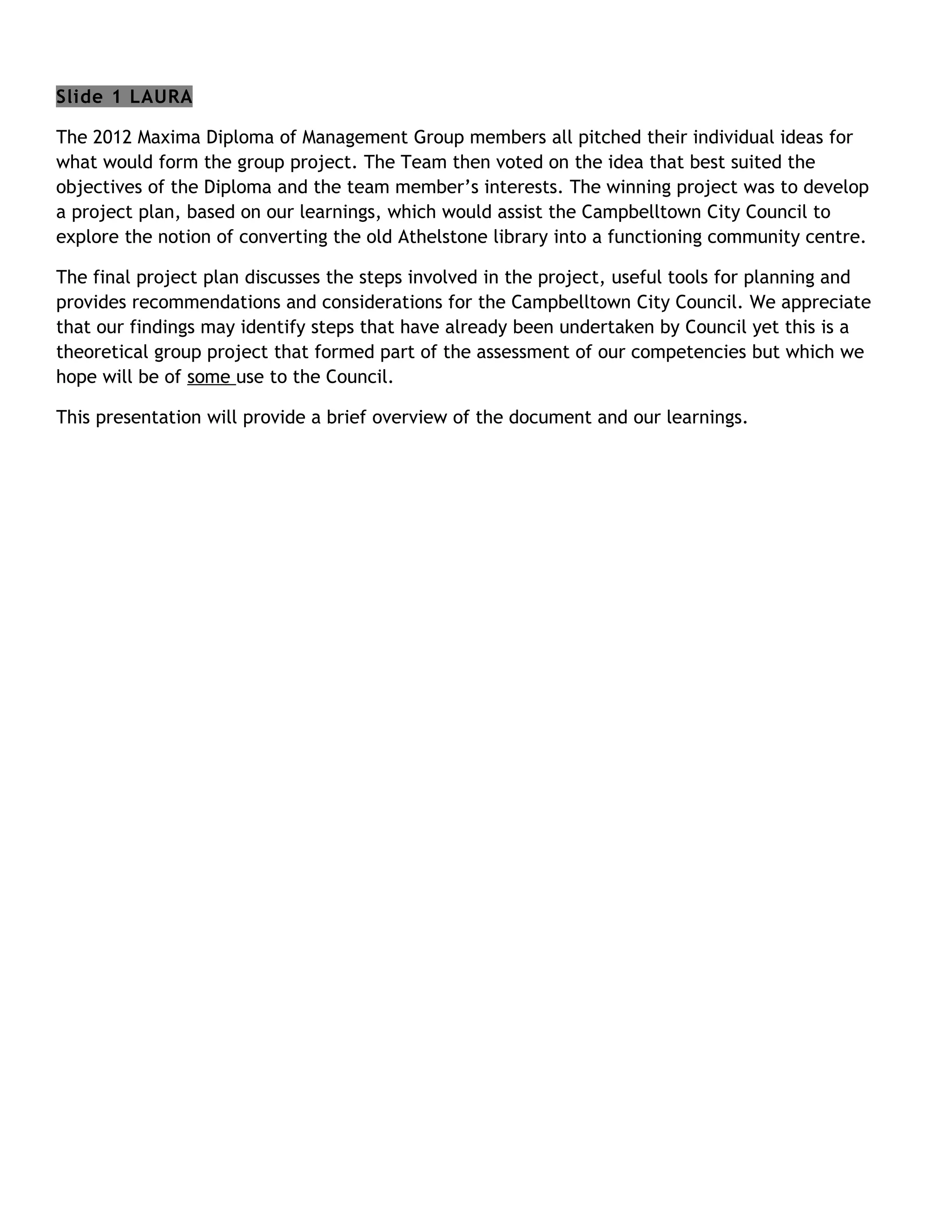 a project plan, based on our learnings, which would assist the Campbelltown City Council to
