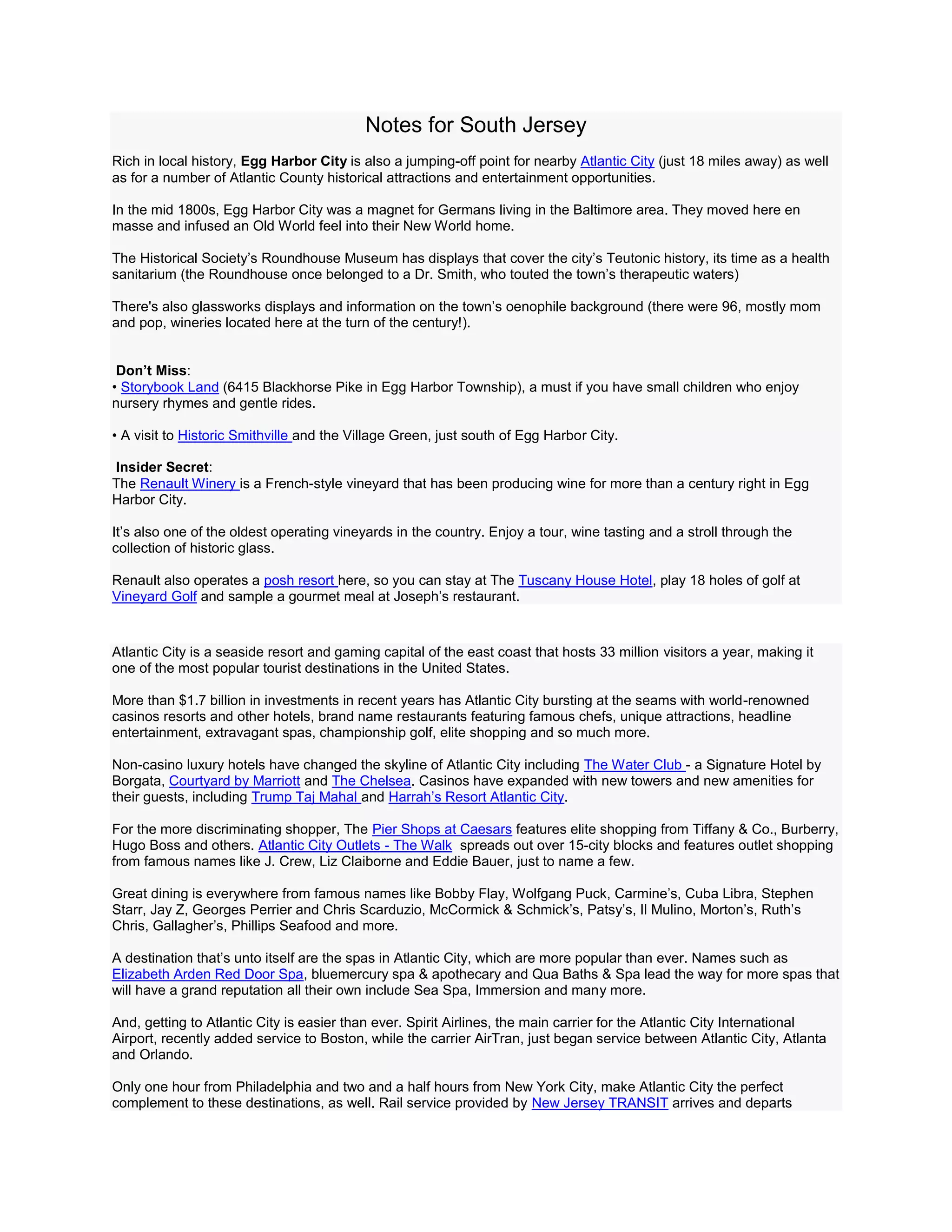 Egg Harbor City is a small town in South Jersey rich in local history and located near Atlantic City. It was settled in the mid-1800s by Germans from Baltimore who brought an Old World feel. The town has museums showcasing its German heritage as well as former industries like glassmaking. Nearby attractions include Storybook Land and Historic Smithville Village.