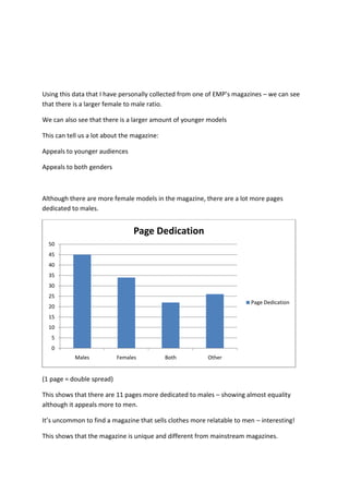 The document analyzes and summarizes information from a magazine published by EMP, focusing on the age, gender, and typical content of models featured. It finds that most models appear to be young adults between 18-30 years old, with a few older models from select bands. While there are more male clothing items and pages dedicated to males, females are featured almost equally. The magazine appeals to both genders but skews slightly younger and more alternative with some dark or risque content that wouldn't be found in mainstream publications.