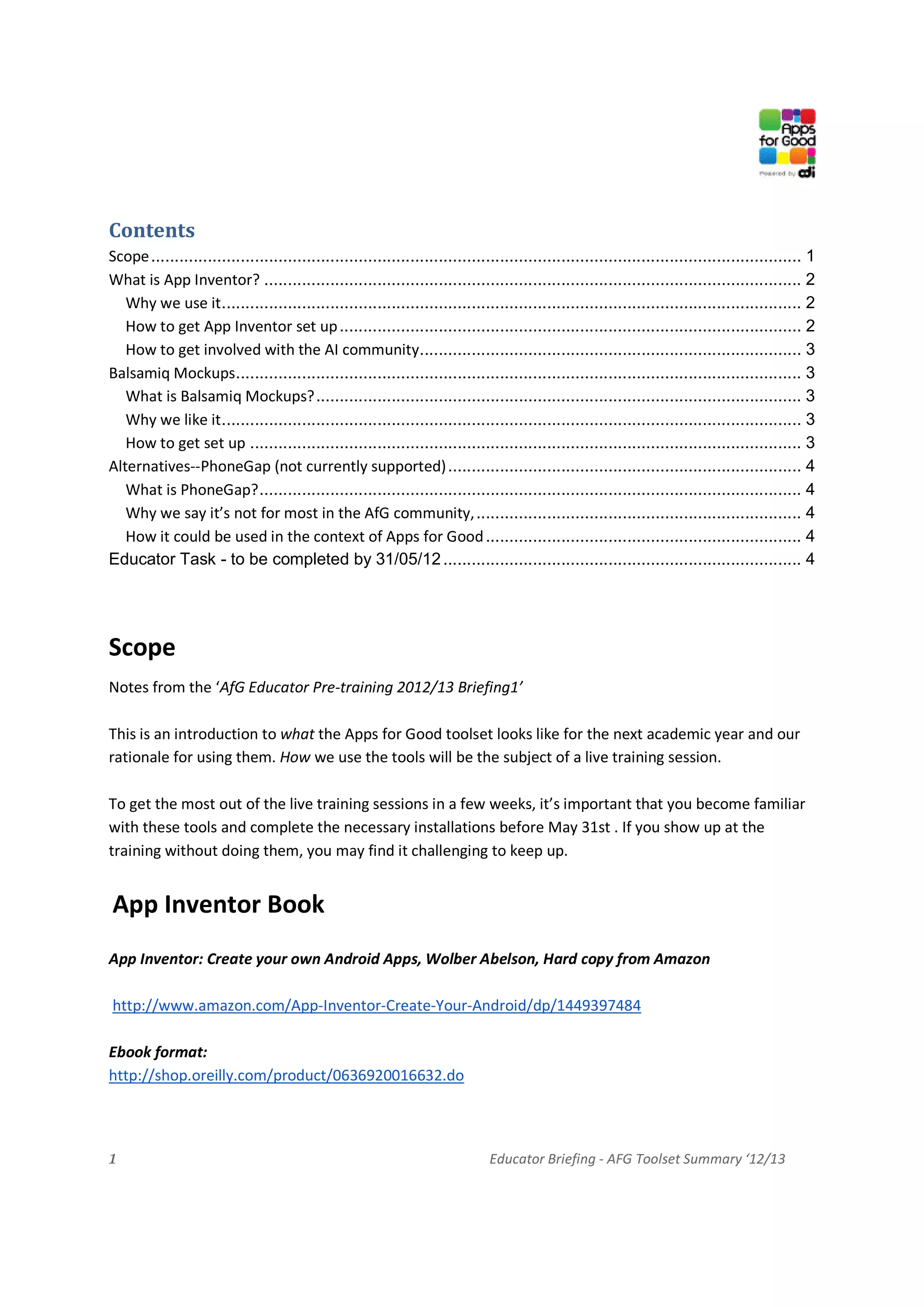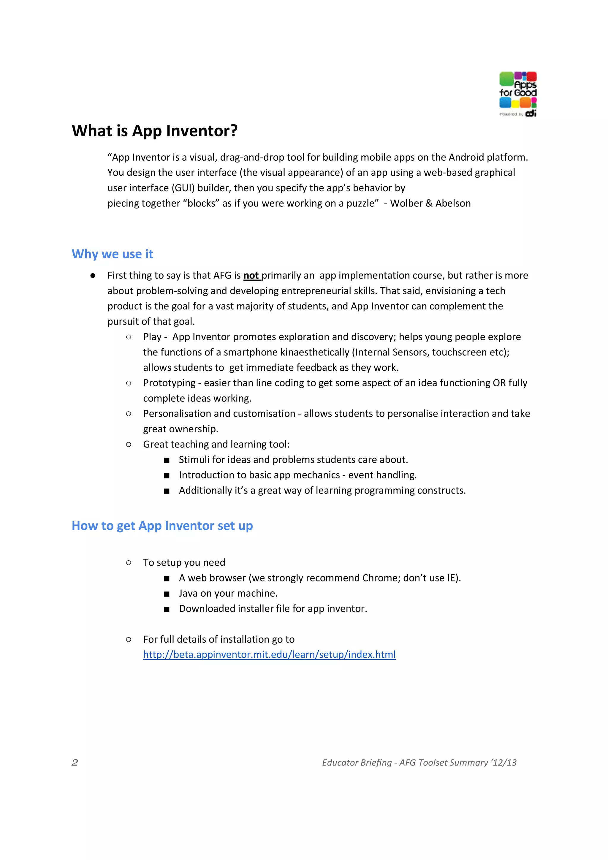 This document provides an overview of the toolset that will be used for the Apps for Good program in the 2012/13 academic year. It summarizes App Inventor, a visual programming tool for building Android apps, Balsamiq Mockups for prototyping apps, and the alternative of PhoneGap. It explains why App Inventor and Balsamiq will be used, how to install them, and get involved in their online communities. Educators are assigned the task of completing an App Inventor tutorial by May 31st to prepare for upcoming training sessions on using these tools.