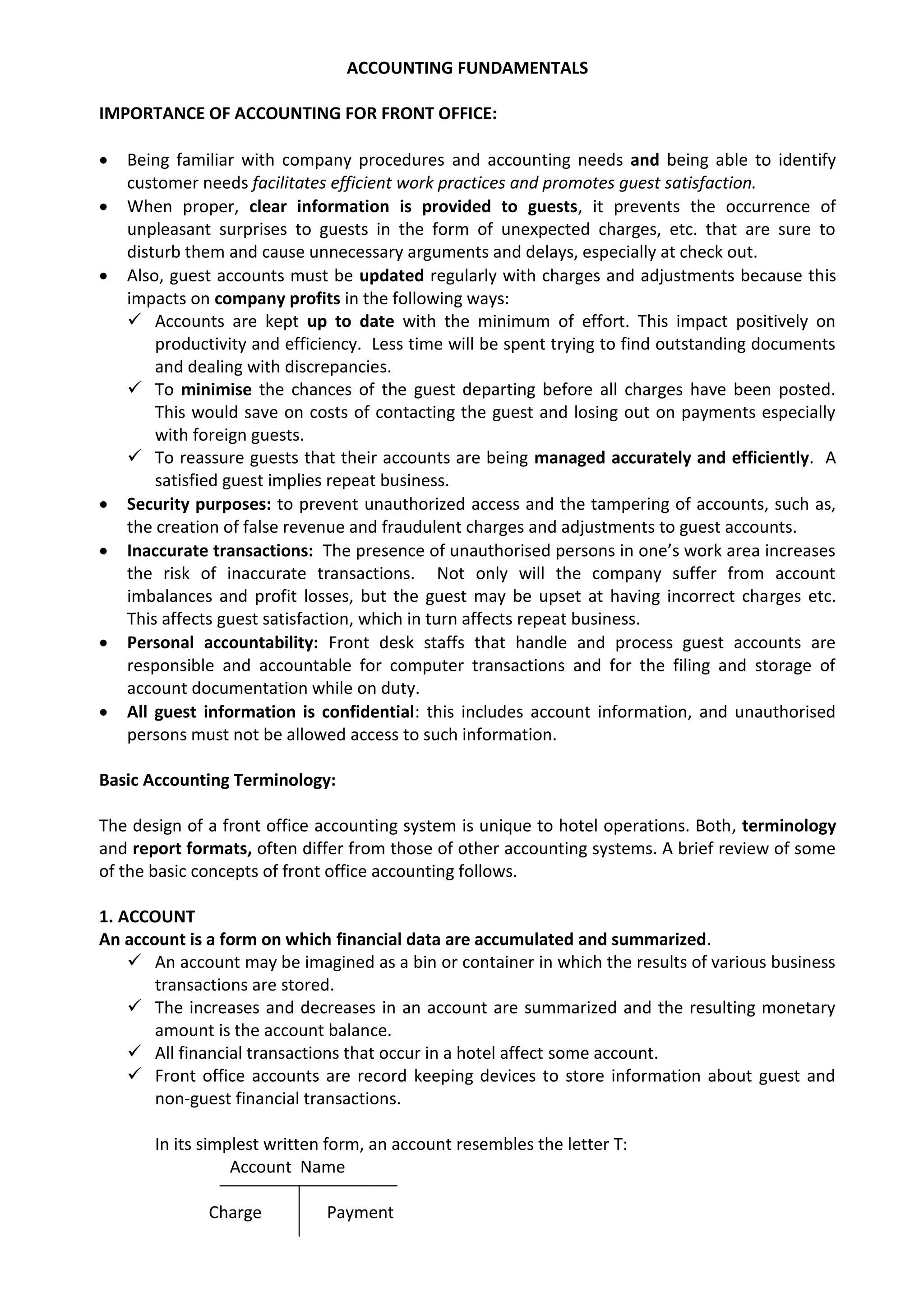 This document provides an overview of front office accounting in a hotel. It explains that a front office accounting system tracks financial transactions with guests and non-guests throughout the guest cycle, from reservation to checkout. Key terms are defined, like accounts, folios, and the three main types of accounts - resident guest accounts, city/non-guest accounts, and management accounts. The importance of accurate front office accounting is also discussed.