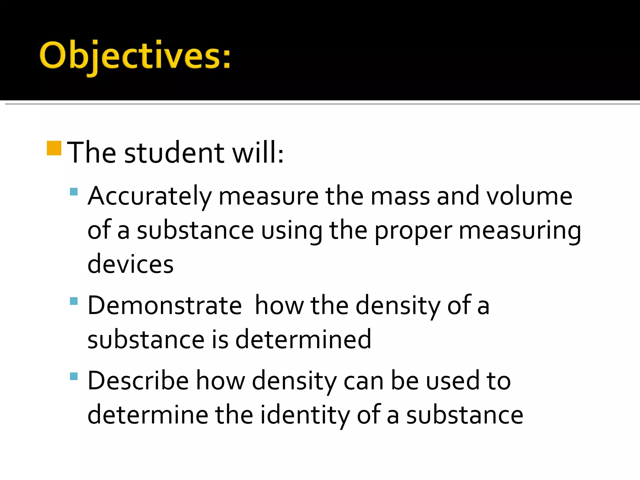 The document discusses density and how it can be used to identify substances. It defines density as the ratio of a substance's mass to its volume. Density is a characteristic property that is unique to each substance and does not depend on the object's shape or size. The document outlines how to calculate density by measuring an object's mass and volume, and divides substances by their typical densities, with solids generally being the most dense and gases the least dense. It also notes that the density of water is 1 g/mL and substances with lower densities will float in water.