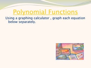 The document discusses graphing and interpreting various polynomial functions using a graphing calculator. It examines the graphs of y=x-1, y=x^2-4, and y=x^3+x^2-12 to note their similarities and differences in terms of degree, number of turns, and x-intercepts. It then explores how changing the coefficients of a cubic function impacts its graph. Finally, it interprets key features of the graph of y=x^3-5x^2+x-5 such as its degree, number of turns, x-intercept, maximum and minimum points.