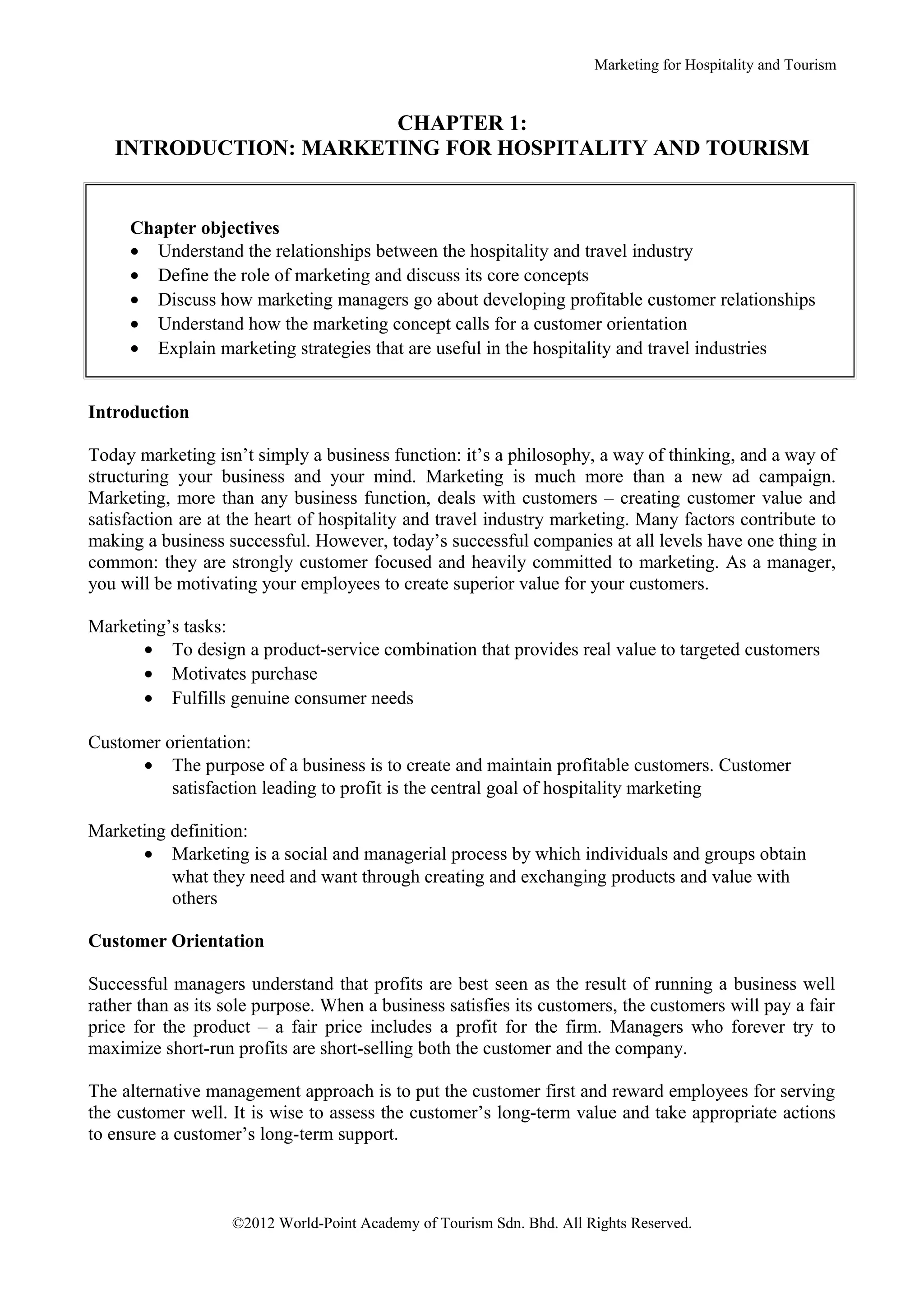 This document provides an introduction to marketing concepts for the hospitality and tourism industries. It discusses key topics such as the importance of customer orientation, the marketing mix, and marketing management philosophies. The marketing mix (4Ps) and extended marketing mix (7Ps) are defined. Core marketing concepts like needs, products, value and exchange are explained. The importance of relationship marketing for hospitality is also highlighted.