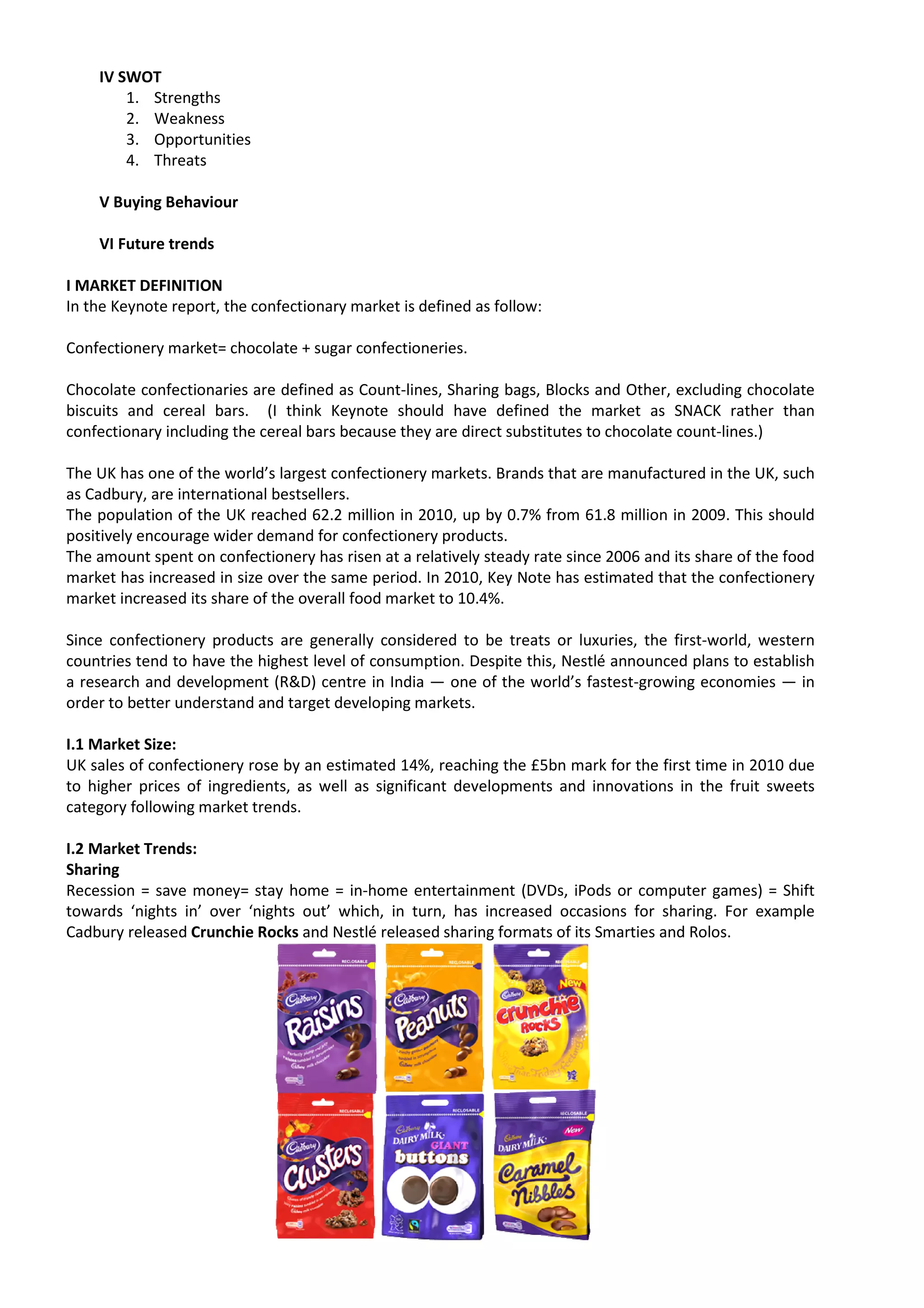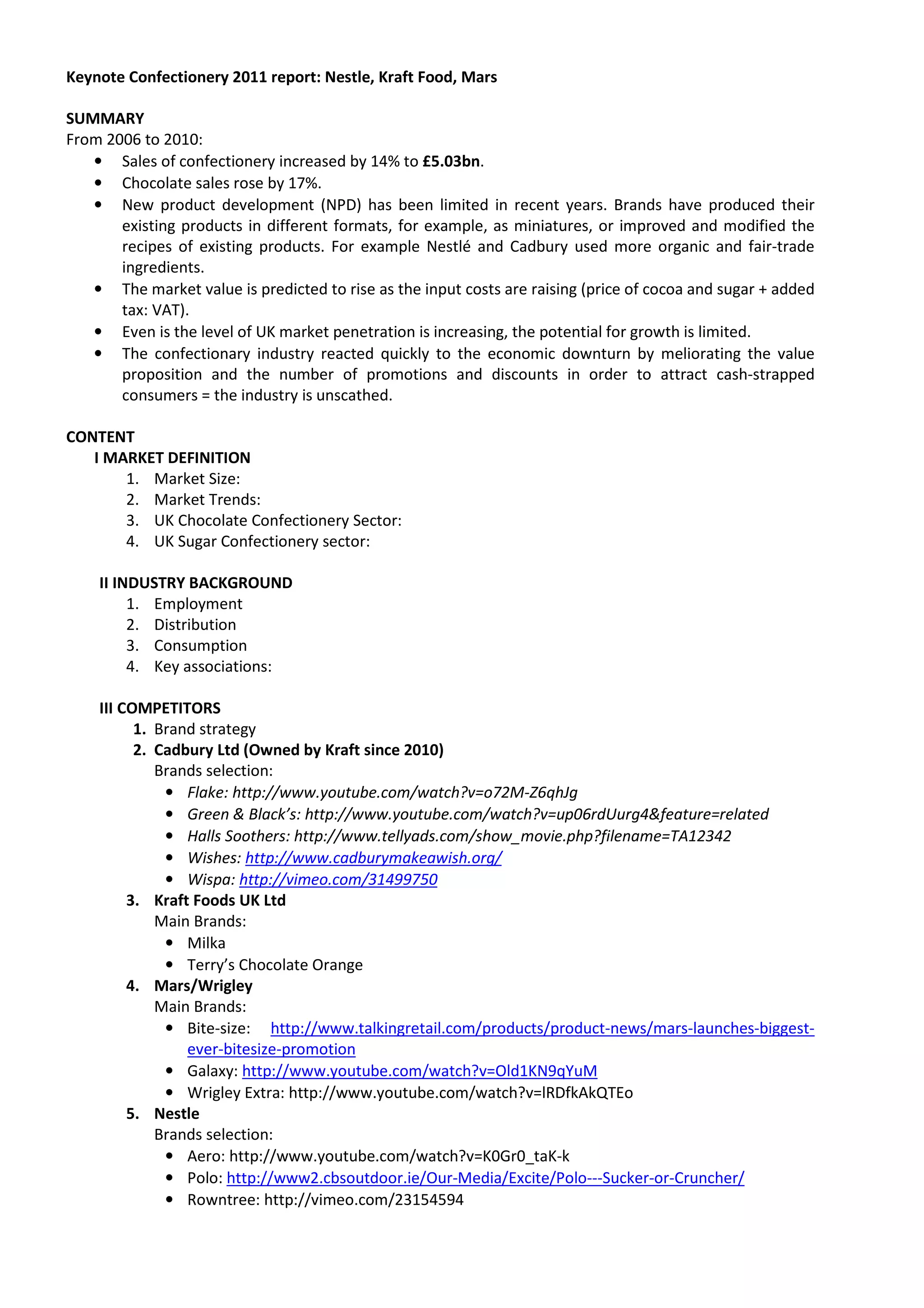 The keynote report on the UK confectionery market from 2006 to 2010 shows a 14% increase in sales, reaching £5.03 billion, driven by rising chocolate sales and limited new product developments. While the industry has adapted to economic challenges through promotions, the potential for growth remains constrained due to high input costs and shifting consumer trends towards healthier options. Major competitors like Cadbury, Nestlé, and Mars dominate the market, with ongoing initiatives in ethical sourcing and product innovation.