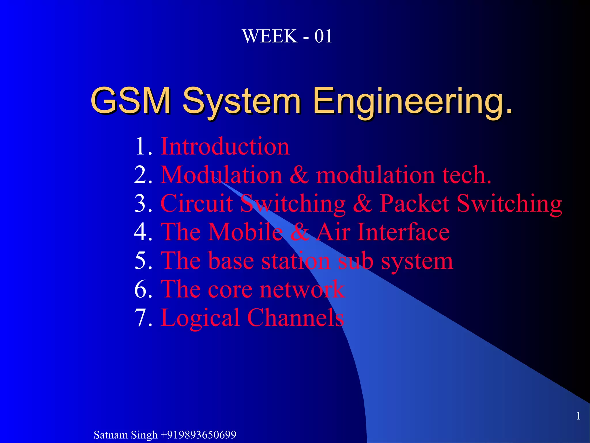 This document provides an overview of GSM network training content that will be covered over 7 weeks. It includes training on various mobile network equipment vendors like Nokia, Siemens, Ericsson, and Motorola. For each week, it lists the components, installation requirements, procedures, troubleshooting, and key points that will be covered for both the base transceiver station and micro wave links of each vendor system. It also includes an introductory section on the evolution of mobile telephone networks and the development of GSM standards.
