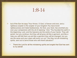 The document contains summaries and notes on various passages from the book of Hebrews in the Bible. It discusses how Jesus is superior to angels and the old covenant, having obtained a better ministry and being the mediator of a better covenant with better promises. It notes that through his death, Jesus destroyed the power of death and set people free from slavery to the fear of death. The document emphasizes that by faith people in the past pleased God, and encourages living a life of faith where one hears God's voice and approaches him, simply believing his word.