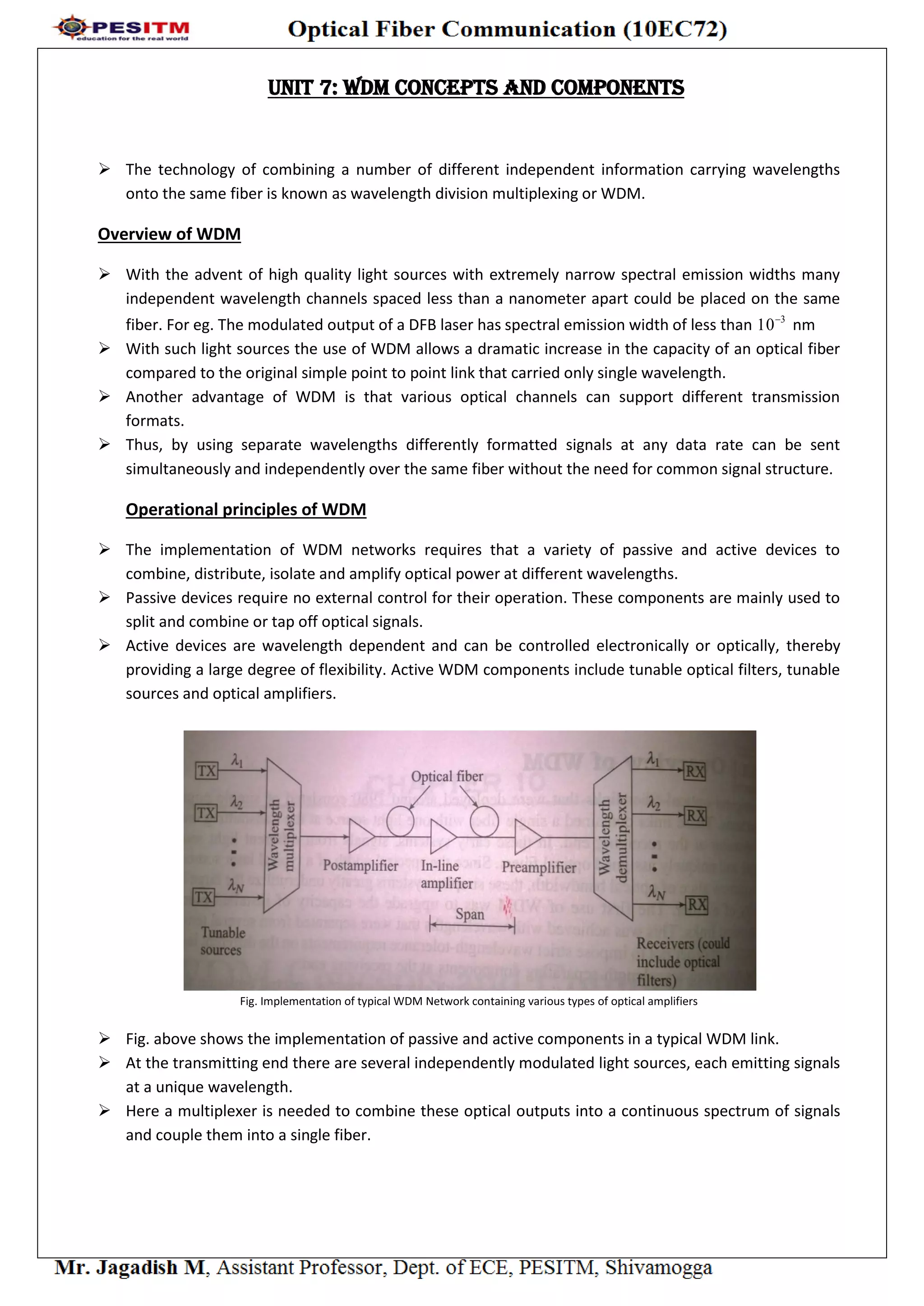 This document summarizes key concepts in wavelength division multiplexing (WDM). It discusses how WDM allows multiple independent wavelengths to be transmitted simultaneously over the same optical fiber, dramatically increasing fiber capacity. It describes the passive and active components used to combine, distribute, isolate, and amplify different wavelengths. These include multiplexers, demultiplexers, optical isolators, thin film filters, and various types of optical amplifiers. WDM standards set by the ITU are also summarized, which specify wavelength grids and channel spacings.